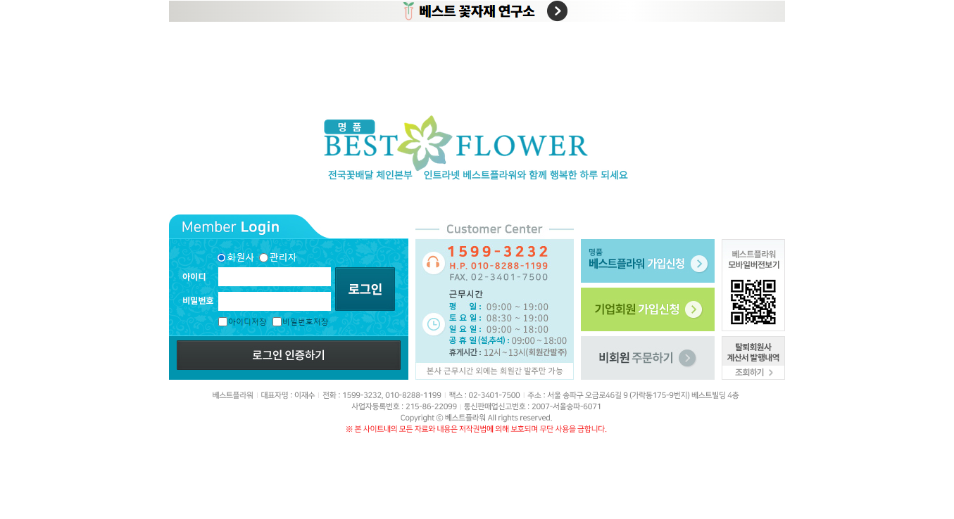 - 베스트플라워 본사로부터 사전 부여받은 아이디와 비밀번호 입력