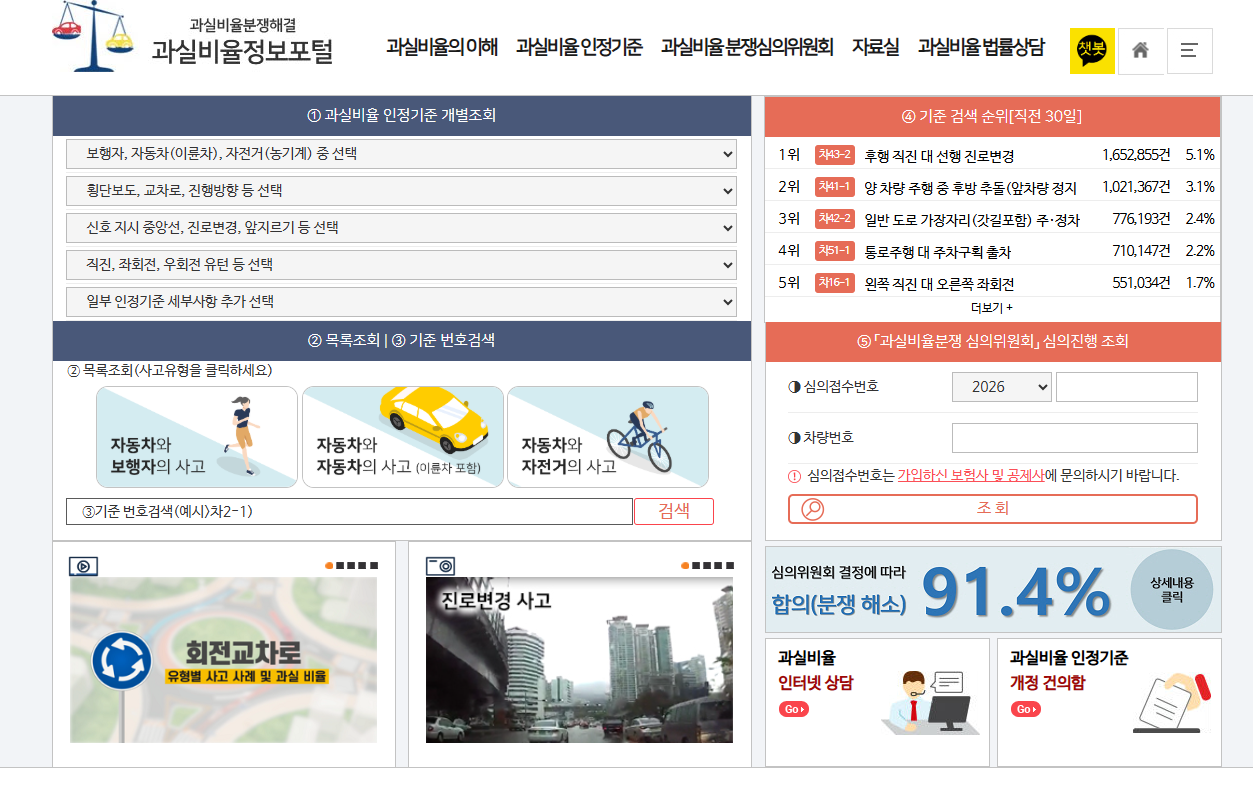 - 자동차사고 과실비율 인정기준 및 ‘나의 과실비율 알아보기’ 서비스: 사고 유형별 기본 과실비율과 대표 사례를 온라인에서 조회할 수 있습니다.