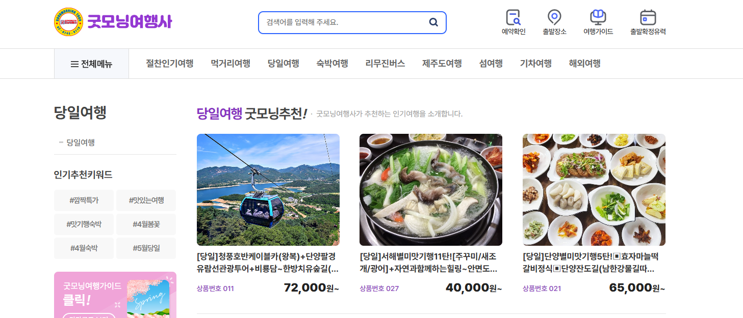 굿모닝여행사의 대표 상품 중 하나는 ‘당일치기 여행’입니다. 바쁜 현대인들을 위해 준비된 짧지만 강렬한 일정으로, 교통, 식사, 입장료 등을 포함한 합리적인 가격과 효율적인 일정이 특징입니다.