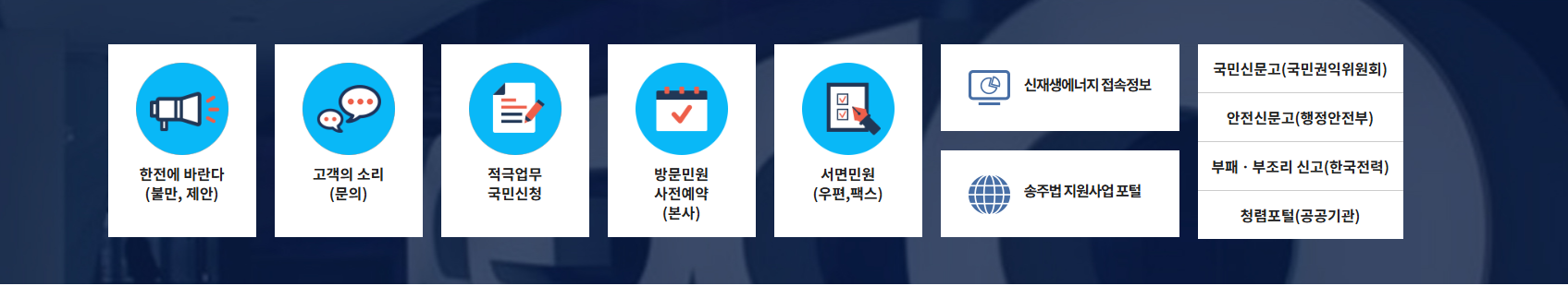 정전, 계약, 납부, 할인 신청까지 전기와 관련된 모든 문제를 해결할 수 있는 통합 서비스 창구입니다.