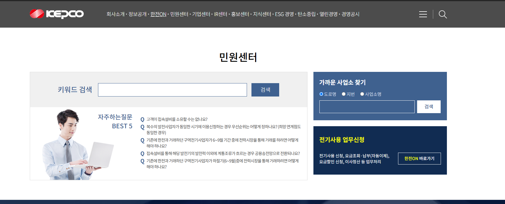 전기사용 신청, 명의변경, 해지, 요금이의 신청 등은