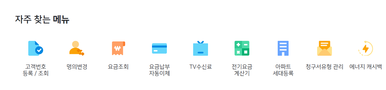 전기요금 조회, 납부, 전기사용 신청, 명의변경, 고장 신고 등