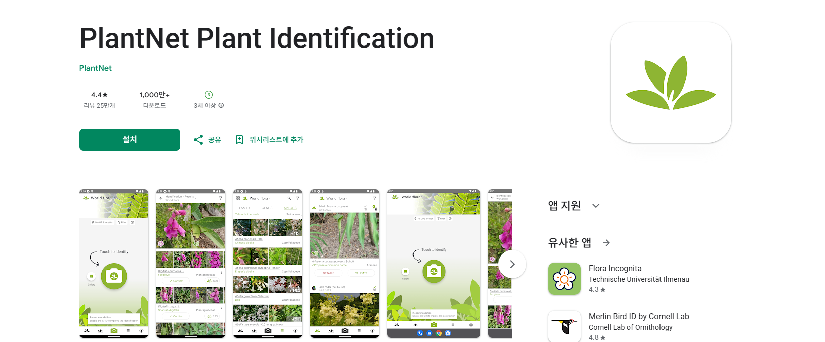 - 특징: 전 세계 식물 사진 데이터베이스 기반, 학술적 가치 높음