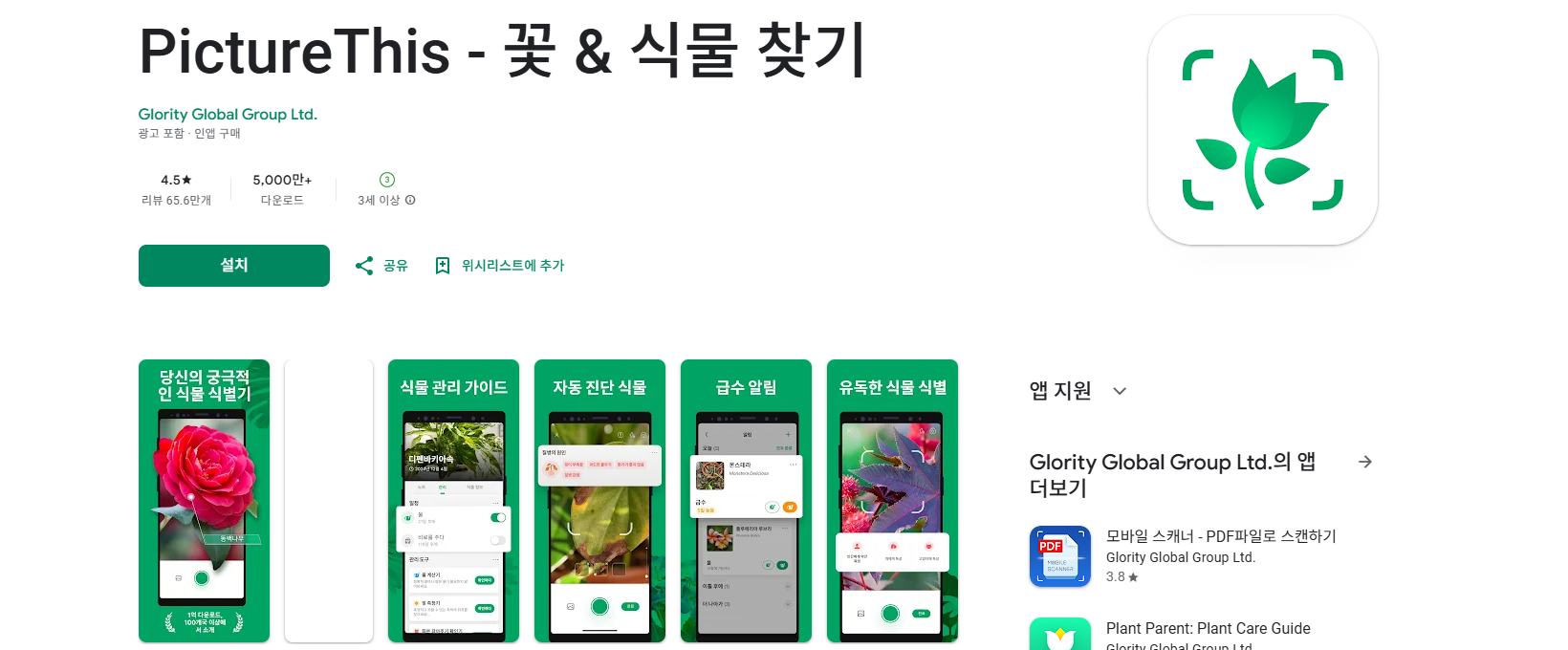 → 구글 렌즈는 정보 검색 중심이고, PictureThis 등은 식물 전용 기능(관리법, 질병 진단 등) 제공.