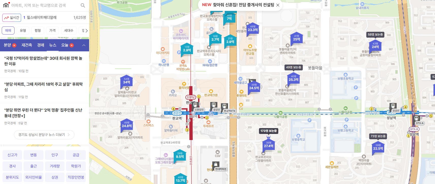 앱 또는 웹에서 지역명, 단지명, 역세권 등을 입력하여
