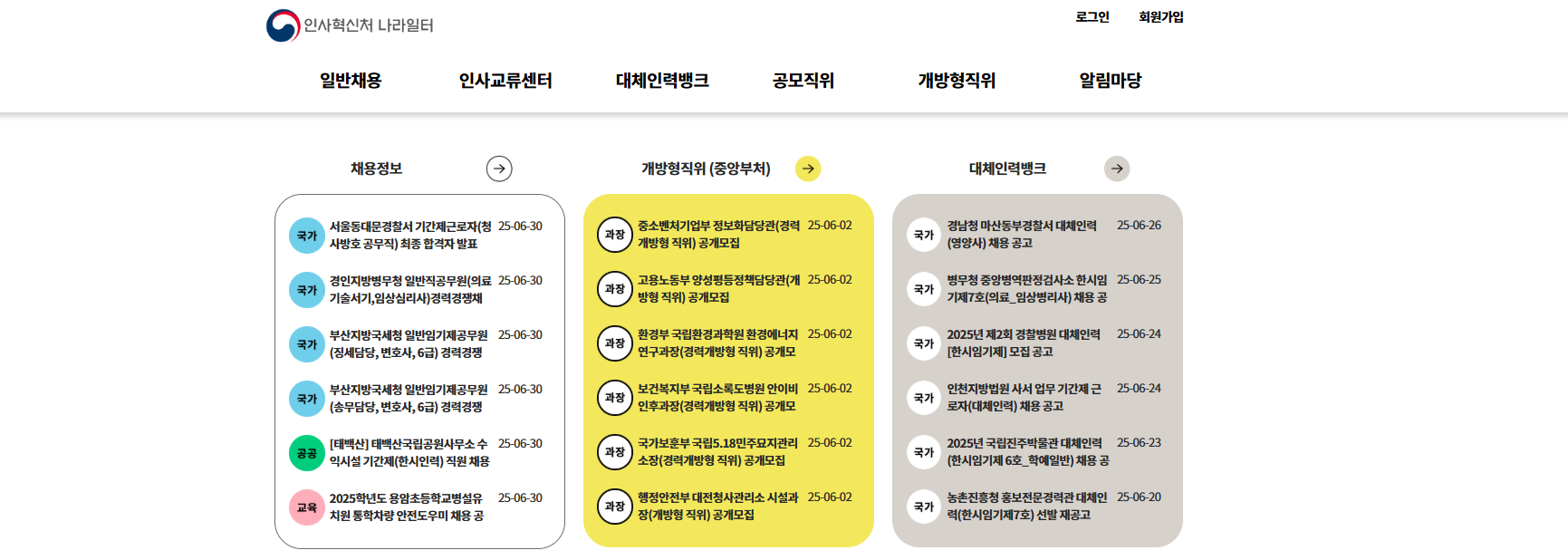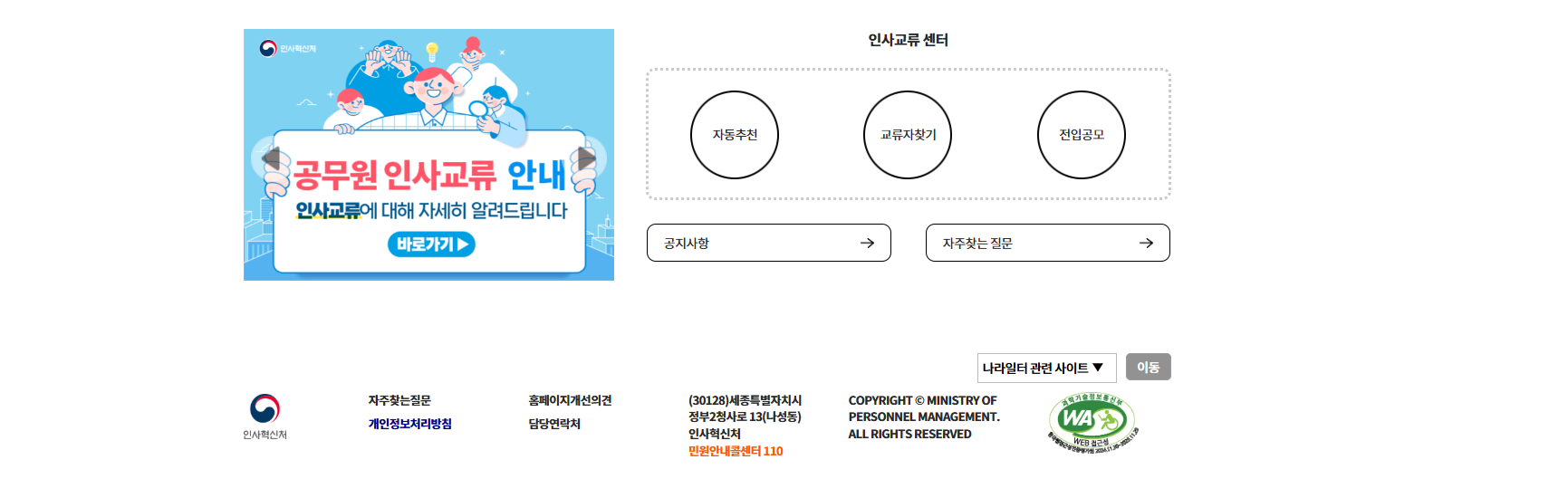 인사혁신처 나라일터는 공무원 및 공공기관 취업, 인사교류, 대체인력 관리 등 공직 인사와 관련된 모든 정보를 한 곳에서 제공하는 필수 플랫폼입니다.
