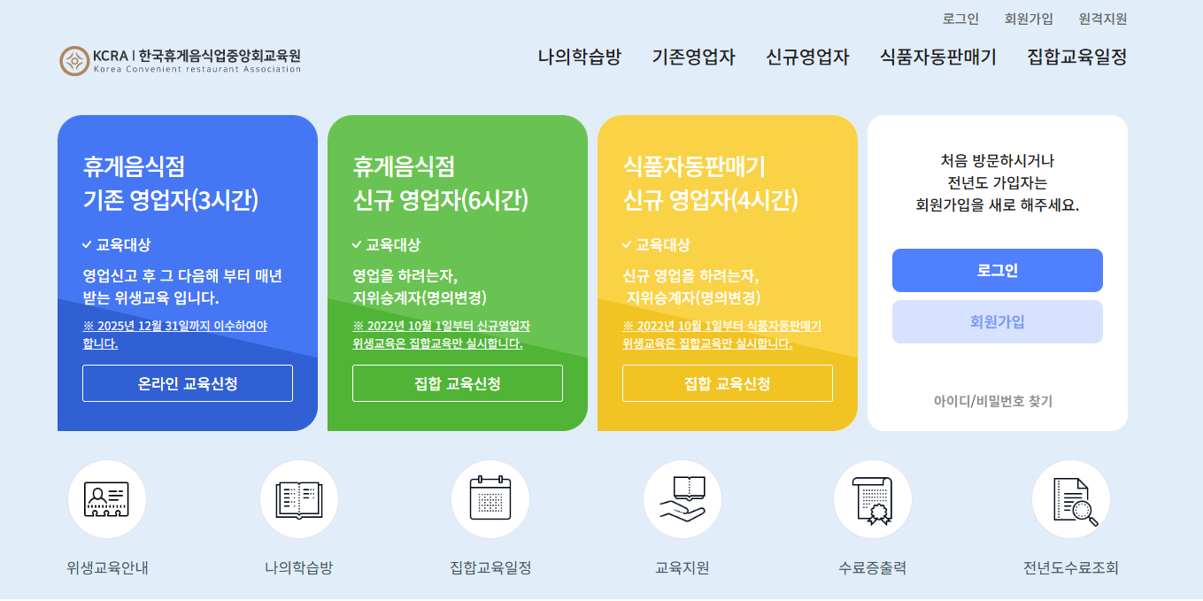 기존 영업자는 휴게음식점 영업신고 후 매년 받아야 하는 보수교육 대상자입니다. 온라인 교육은 3시간 과정으로 진행되며, 교육비는 20,000원입니다. 교육 기간은 15일이며, 5개 필수 과목을 수강한 후 학습평가에서 60점 이상을 획득하면 수료할 수 있습니다. 2025년 12월 31일까지 해당 연도 교육을 반드시 이수해야 합니다.