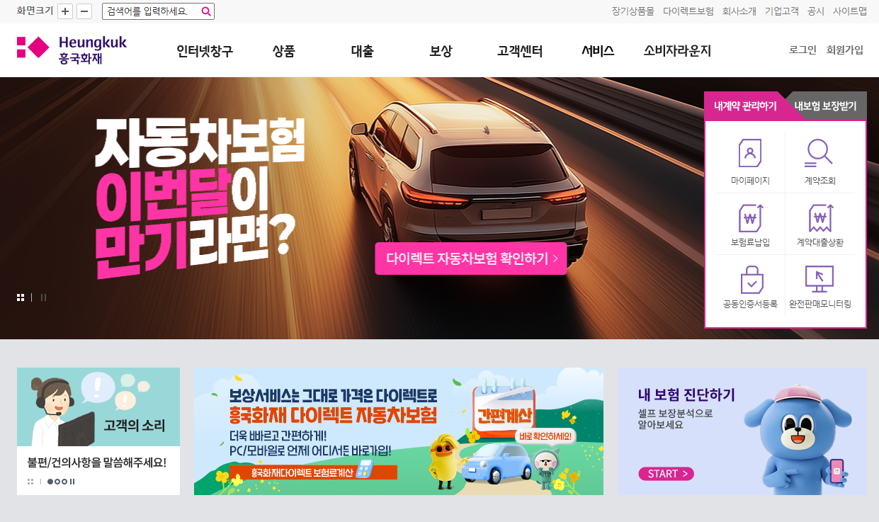 흥국화재 공식 홈페이지(heungkukfire.co.kr)에서는 보험 가입부터 계약 관리까지 다양한 서비스를 온라인으로 이용할 수 있다.